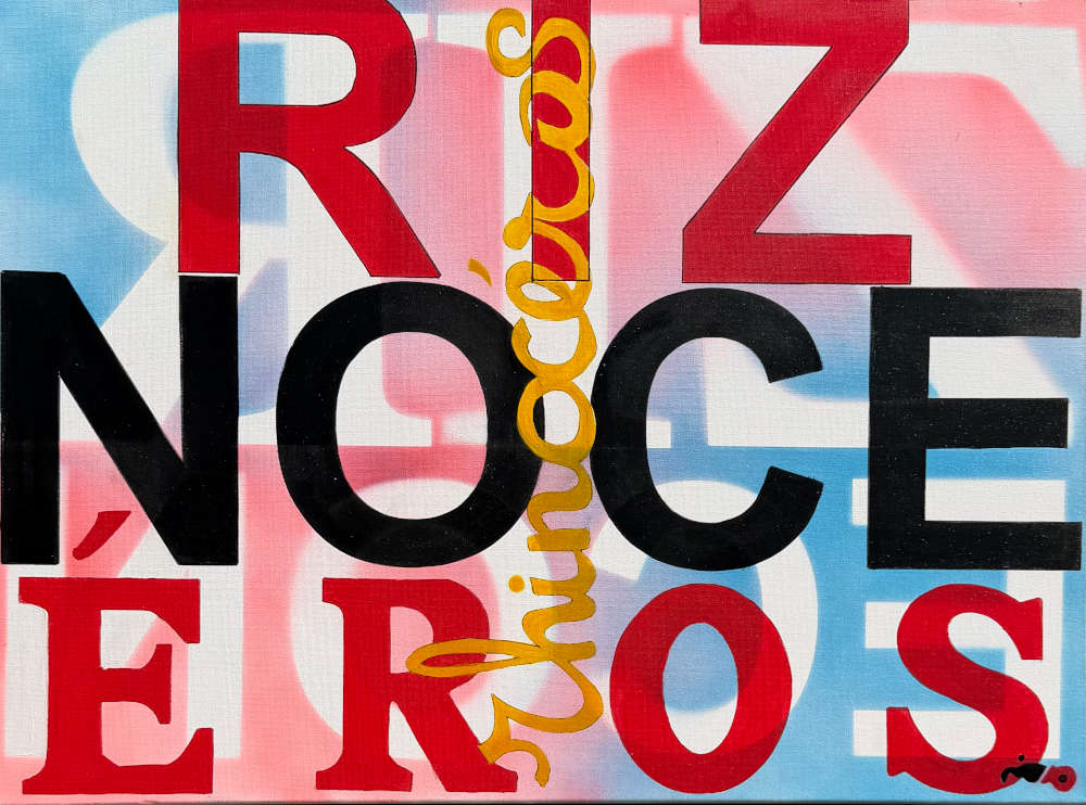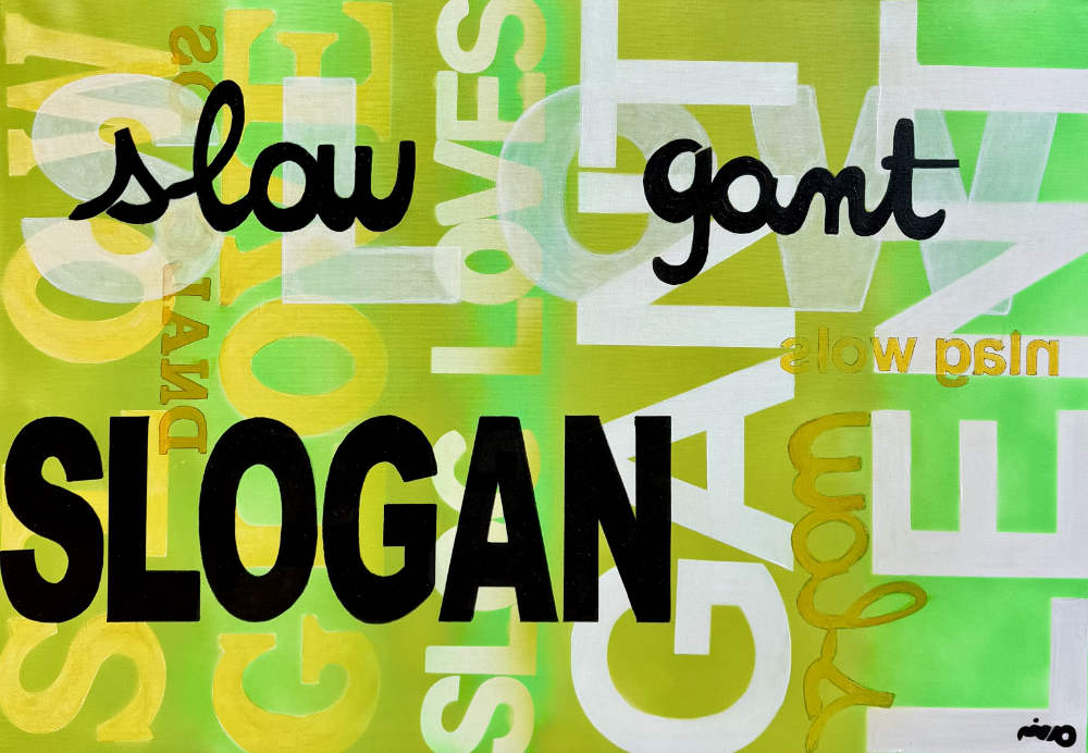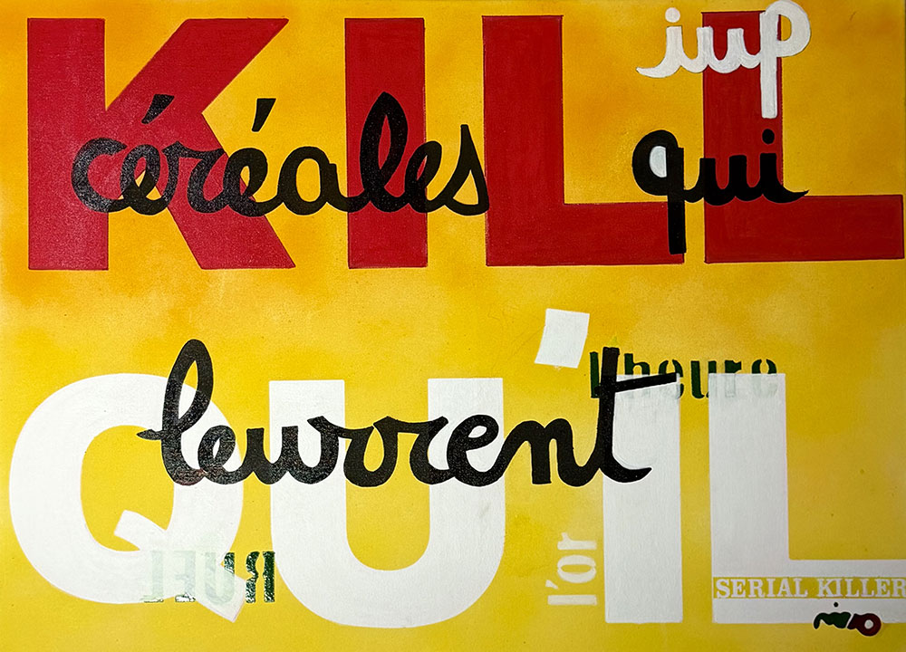 Dans cette perspective, l’écriture n’est plus seulement un vecteur de signification, de sens mais un matériau. Le Script Art explore un territoire situé entre langage et peinture. Il ne s’agit pas simplement d’introduire des mots dans l’image mais de déplacer l’écriture hors de sa fonction habituelle pour la faire entrer dans le champ de la forme. Le mot cesse d’être uniquement porteur de sens. Il devient ligne, rythme, tension graphique. Les mots, les phrases, les slogans ne sont plus tels qu’ils paraissent être. Ils disent autre chose que ce dont il s’agit de beaucoup plus poétique, excitant et addictif.